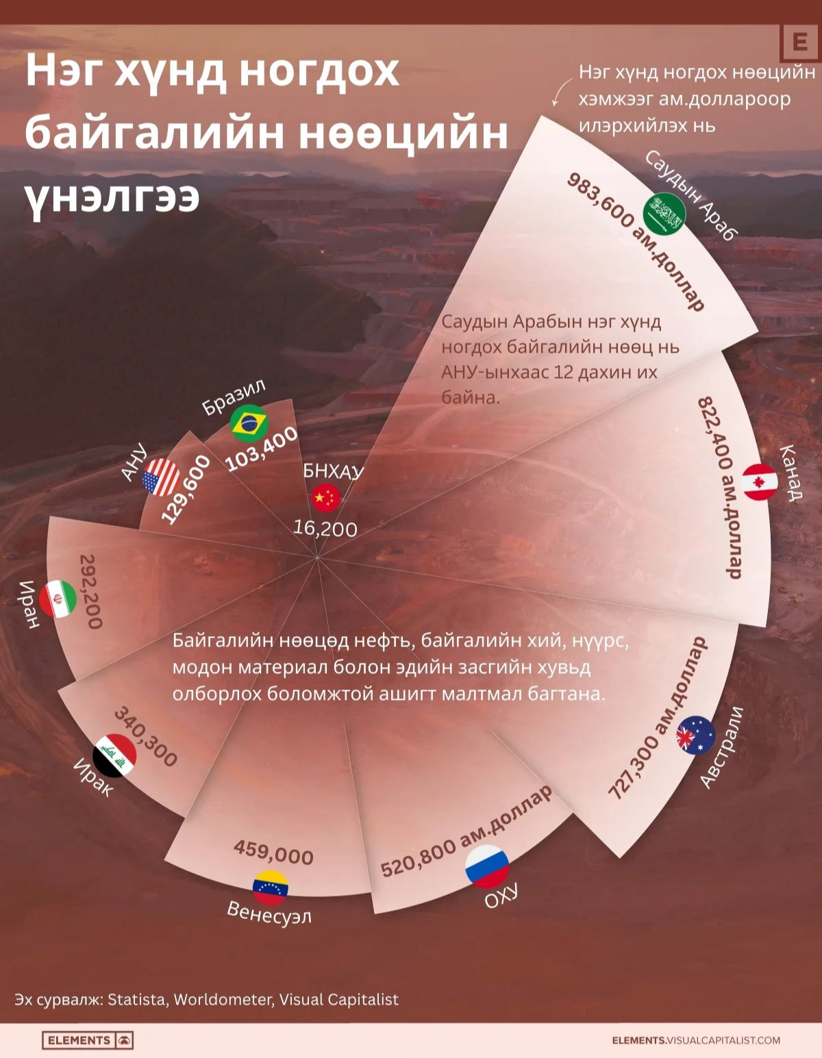 Дэлхийд байгалийн нөөцөөр тэргүүлэгч орнуудын нэг хүнд ногдох нөөцийн үнэлгээ хэдэн америк доллартой дүйцэх вэ? Энэхүү жагсаалтыг боловсруулахдаа байгалийн нөөцийн нийт үнэлгээгээр түүчээлдэг 10 улсын үзүүлэлтийг 2025 оны хүн амын тоотой харьцуулан гаргажээ.