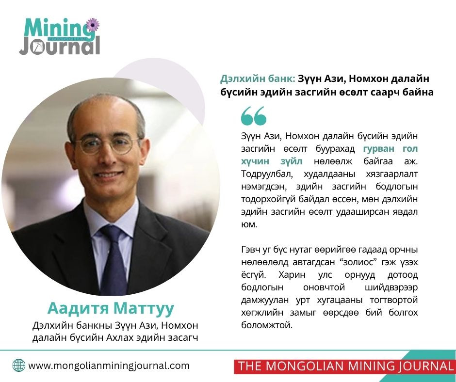 Зүүн Ази, Номхон далайн бүсийн Ахлах эдийн засагч Аадитя Маттуу хэлэхдээ 2025 онд эдийн засгийн өсөлт өмнөх оныг бодвол буурах төлөвтэй бөгөөд ирэх онд ч энэ хандлага үргэлжлэхээр байгааг онцолсон юм.