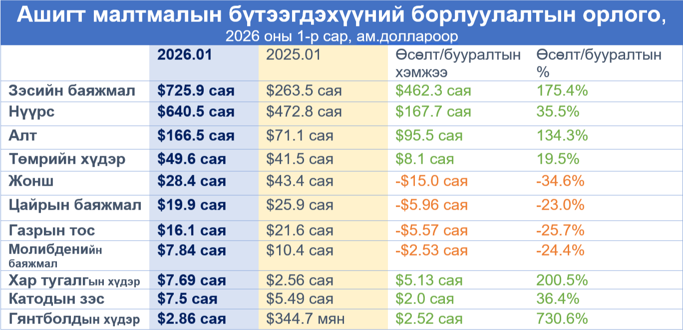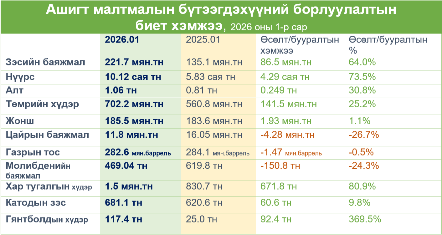 Тодруулбал нүүрсний экспорт энэ оны эхний сарын байдлаар 10.1 сая тоннд хүрч, өмнөх оны мөн үеийнхээс 73.5%-иар өсөв. Харин орлогын дүн нь 640 сая ам.доллартой тэнцэж, 35.5%-иар дээшиллээ. Ийнхүү 2026 оны нэгдүгээр сард нүүрсний экспортын борлуулалтын биет хэмжээ сарын дүнгээрээ эхнээсээ хоёрдугаарт орох дээд үзүүлэлт боллоо.