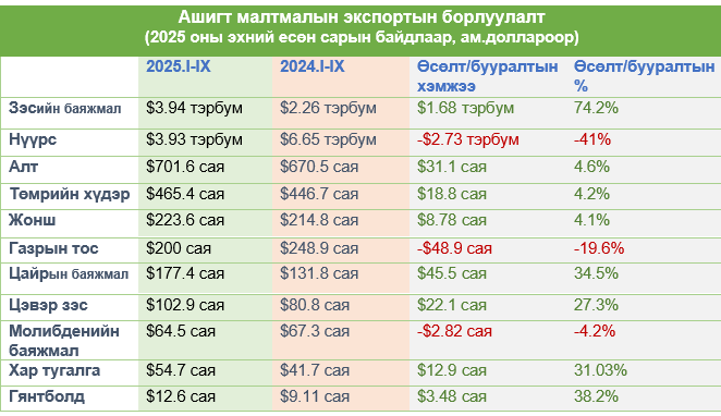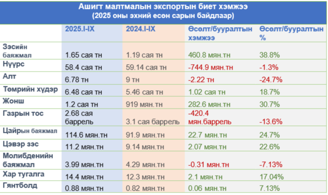 Ззсийн баяжмал, нүүрс, алтны экспорт энэ хугацаанд улсын нийт экспортын 80%-ийг бүрдүүлжээ.