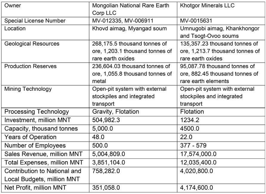 Currently, existing operational licenses have been validated under Article 49.1 of the 2006 Minerals Law. Among the six companies holding licenses in the REE sector, Mongolian National Rare Earth Corp LLC and Khotgor Minerals LLC have completed their feasibility studies and are ready to move into the production phase.