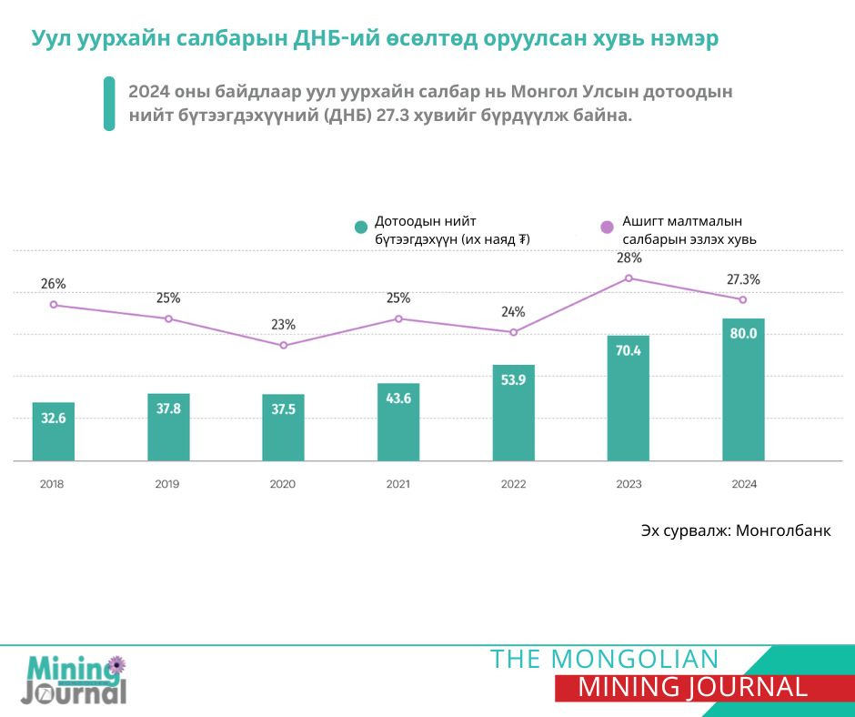 Монгол Улсын хувьд уул уурхайн салбар улсын төсөв болон экспортын орлогод эзлэх байр суурь нь улам батжиж байна. Аж үйлдвэр, эрдэс баялгийн яам болон Монголын Уул Уурхайн Үндэсний Ассоциацийн тайланд дурдсанаар 2024 онд ашигт малтмалын нөөцийн салбар улсын төсвийн нийт орлогын 33 хувийг бүрдүүлжээ.